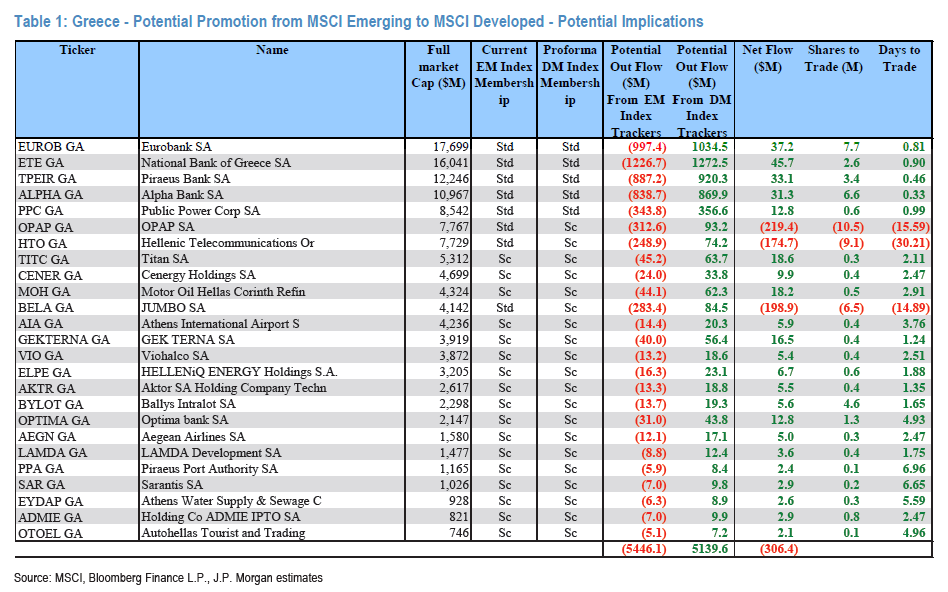 Με τον τίτλο «Yes, we are very unhappy that MSCI will upgrade Greece to DM» (Πράγματι, δεν είμαστε χαρούμενοι που ο MSCI θα αναβαθμίσει την Ελλάδα στις ανεπτυγμένες αγορές), η JP Morgan δεν κρύβει την έκπληξή της με την επιτάχυνση των διαδικασιών από τον οίκο, εκτιμώντας μάλιστα ότι εκροές που θα υπάρξουν θα είναι της τάξεως των 500 εκατ. δολαρίων.