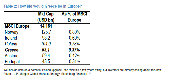 Σύμφωνα με τους υπολογισμούς της JP Morgan, η Ελλάδα θα εισέλθει στον MSCI Europe με πέντε μετοχές, έναντι οκτώ που περιλαμβάνονται σήμερα στον δείκτη αναδυόμενων αγορών. Το ειδικό βάρος της χώρας στον MSCI Europe εκτιμάται στις 37 μονάδες βάσης, γεγονός που την καθιστά τη δεύτερη μικρότερη αγορά του δείκτη: μεγαλύτερη από την Πορτογαλία, αλλά μικρότερη από την Ιρλανδία και την Αυστρία.