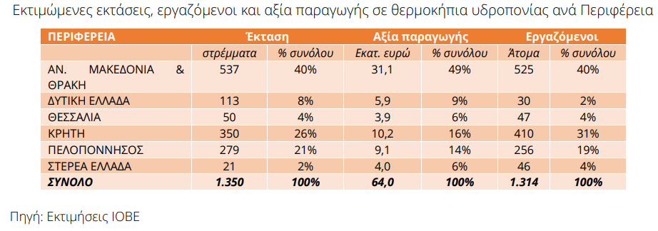 Όπως αναφέρει σε μελέτη του το ΙΟΒΕ, η ανταγωνιστική και ποιοτική ελληνική παραγωγή από τη θερμοκηπιακή γεωργία εκτός εδάφους (ΘΓΕΕ) στην Ελλάδα και άλλες τεχνολογικά αναβαθμισμένες θερμοκηπιακές μονάδες θα μπορέσει να ικανοποιήσει τις ανάγκες της εγχώριας αγοράς κηπευτικών-λαχανικών που σε αυξανόμενο βαθμό καλύπτονται από εισαγωγές.