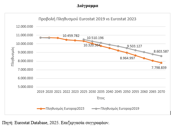 Ειδικότερα, στις δημογραφικές προβολές του 2019 η Eurostat προέβλεπε ότι ο πληθυσμός της Ελλάδας μέχρι το 2070 θα μειώνονταν σε 8,6 εκατ. κατοίκους από 10,7 εκατ. κατοίκους που ήταν το 2019 (μείωση 19,7%). Στις επικαιροποιημένες δημογραφικές προβολές που εκπονήθηκαν τέσσερα χρόνια μετά (2023) (Απρίλιος 2023, Europop 2023), η Eurostat προβλέπει ότι ο πληθυσμός της χώρας μας θα μειωθεί από 10,435 εκατ. κατοίκους το 2022 σε 7,8 εκατ. κατοίκους το 2070 (μείωση 31%) (Διάγραμμα).