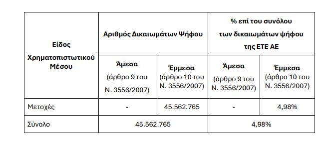 Η Εθνική Τράπεζα της Ελλάδος A.E. (η «Τράπεζα/ΕΤΕ ΑΕ») ανακοινώνει, σύμφωνα με το άρθρο 14 του Ν. 3556/2007, τα ακόλουθα:
