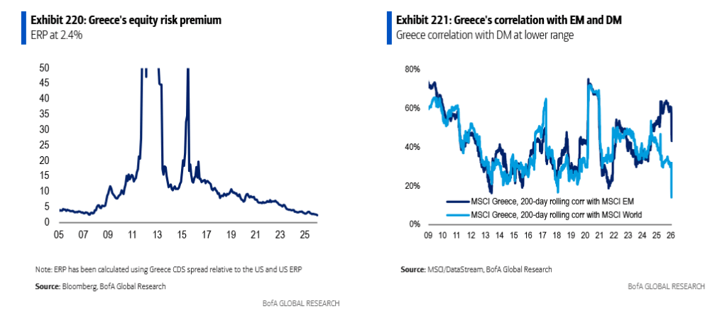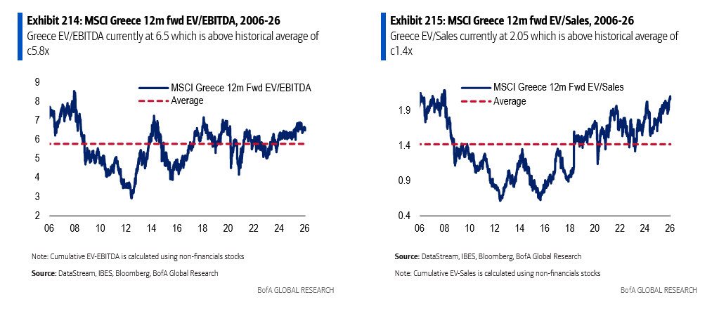 H Bank of America διατηρεί την ελληνική αγορά (όπως και αυτές της Νότιας Αφρικής και της Ουγγαρίας) σε σύσταση overweight, σημειώνοντας ότι ως αγορά (εξαιρουμένων των τραπεζών) διαπραγματεύεται κάτω από τους ιστορικούς μέσους όρους σε όρους P/E, ενώ σε όρους P/B κινείται κοντά στα ιστορικά επίπεδα. Τα πολλαπλάσια EV βρίσκονται επίσης κοντά στους μακροπρόθεσμους μέσους όρους.