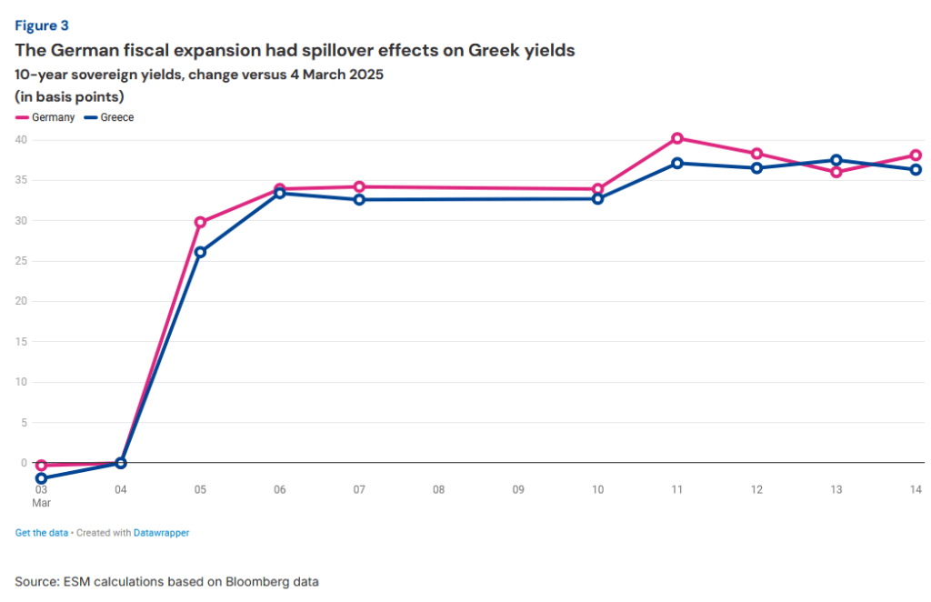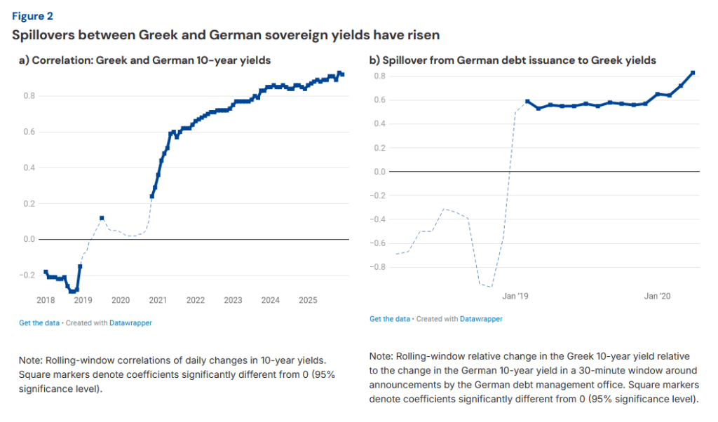 Δεύτερον, οι ανακοινώσεις που αφορούν την έκδοση γερμανικού χρέους επηρεάζουν πλέον άμεσα και τις ελληνικές αποδόσεις, κάτι που δεν παρατηρούνταν πριν από το 2020–2021.