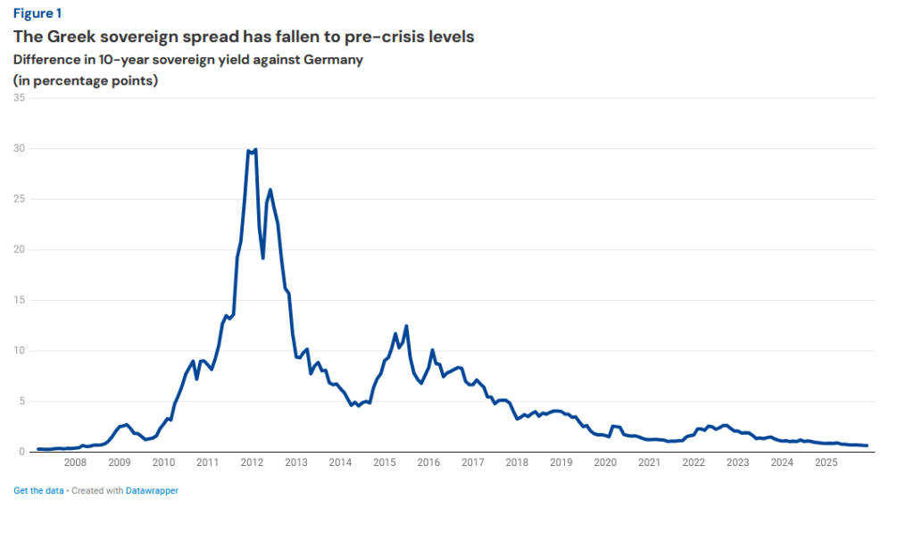 Τον Μάιο του 2025, το ελληνικό spread –η διαφορά απόδοσης του δεκαετούς ελληνικού ομολόγου έναντι του γερμανικού Bund, που αποτελεί σημείο αναφοράς για την ευρωζώνη– υποχώρησε κάτω από τις 80 μονάδες βάσης για πρώτη φορά από το 2007, σύμφωνα με στοιχεία και υπολογισμούς του ESM.