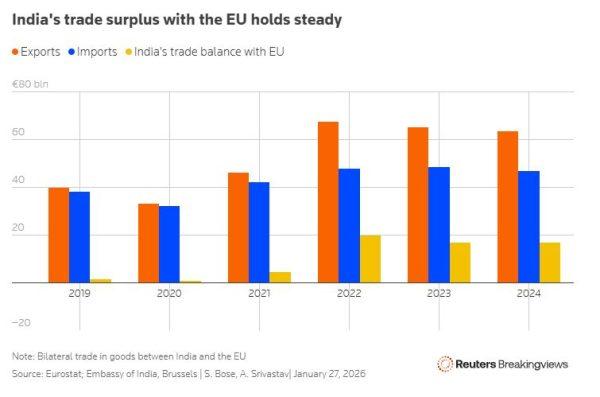 Τα συνολικά κέρδη της ΕΕ παραμένουν μικρά, αλλά η σύγκριση με τη λιγότερο ευνοϊκή εμπορική συμφωνία που υπέγραψε η Βρετανία με την Ινδία πέρυσι αναδεικνύει τη σημασία μιας μεγάλης εγχώριας αγοράς. Οι Βρυξέλλες μπορούν να παρουσιάσουν μικρές παραχωρήσεις ως σημαντικά οφέλη, επειδή εξάγουν μόνο το 2% των προϊόντων τους στην Ινδία, ενώ φιλοξενούν το 18% των ινδικών πωλήσεων.
