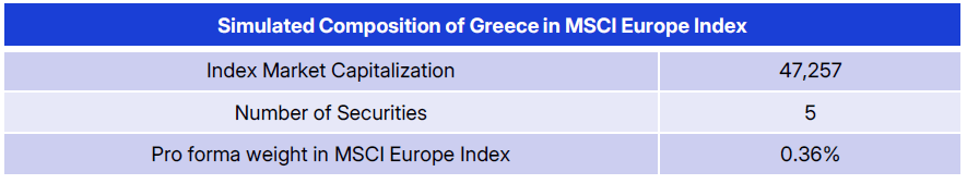 Σύμφωνα πάντα με την άσκηση προσομοίωσης, ο δείκτης βαρύτητας της Ελλάδας στον MSCI Europe Index θα είναι 0,36%, με τις τραπεζικές μετοχές να έχουν τη μερίδα του λέοντος.