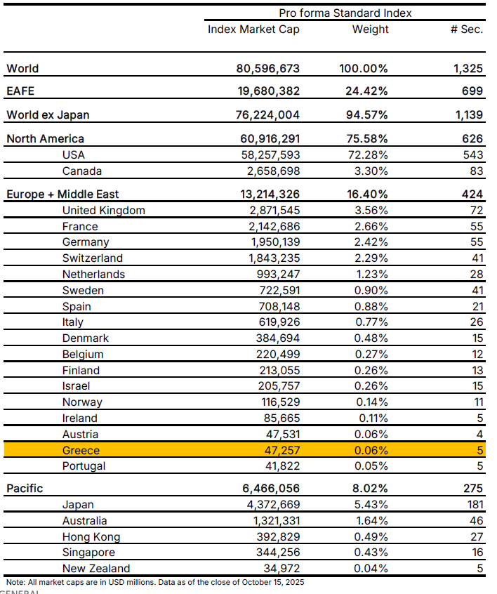 Ωστόσο, ο συντελεστής του MSCI Greece Index στον MSCI World Index, στον παγκόσμιο δηλαδή, θα είναι μόλις 0,06%, από 0,57% που είναι τώρα στον MSCI Emerging Markets Index.