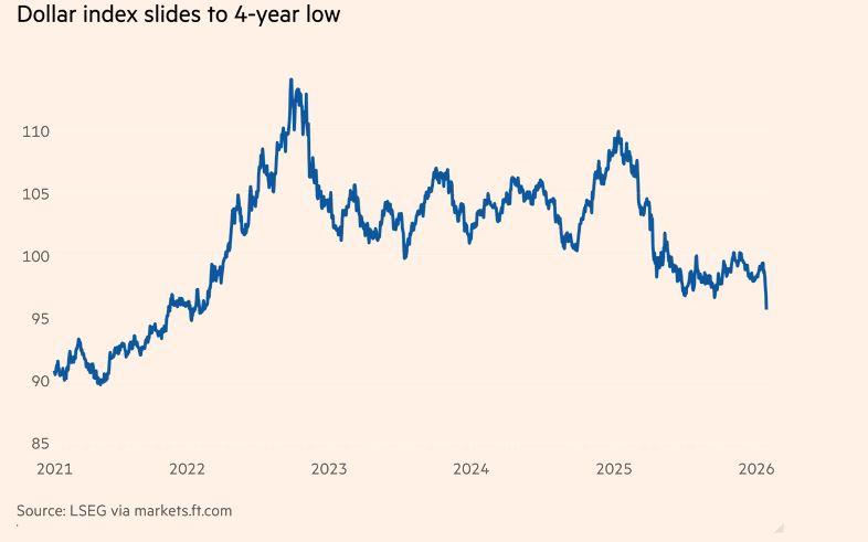Το δολάριο υποχώρησε κατά 1,3% έναντι ενός καλαθιού άλλων σημαντικών νομισμάτων την Τρίτη, με αποτέλεσμα να διαπραγματεύεται στο χαμηλότερο επίπεδο των τελευταίων τεσσάρων ετών και να έχει υποχωρήσει κατά 2,6% από την αρχή του 2026. Την Τετάρτη στην Ασία υποχώρησε περαιτέρω κατά 0,1%.