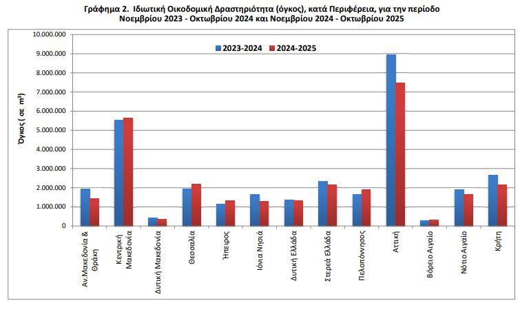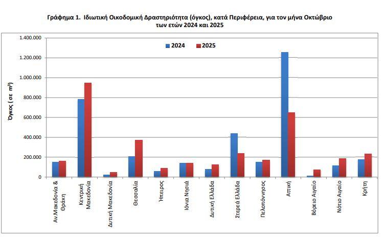 Συγκεκριμένα, οι εκδοθείσες άδειες Ιδιωτικής Οικοδομικής Δραστηριότητας, στο σύνολο της Χώρας, κατά τον μήνα Οκτώβριο 2025 ανήλθαν σε 2.977 οικοδομικές άδειες, που αντιστοιχούν σε 694.493 m2 επιφάνειας και 3.437.754 m3 όγκου, παρουσιάζοντας αύξηση κατά 14,4% στον αριθμό των οικοδομικών αδειών, μείωση κατά 4,8% στην επιφάνεια και μείωση κατά 4,4% στον όγκο, σε σχέση με τον αντίστοιχο μήνα του 2024.