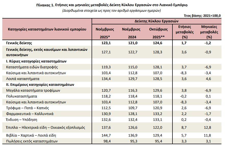 Αύξηση 1,7% παρουσίασε ο Γενικός Δείκτης Κύκλου Εργασιών στο λιανεμπόριο κατά τον μήνα Νοέμβριο 2025, σε σύγκριση με τον αντίστοιχο δείκτη του Νοεμβρίου 2024, ενώ σε σύγκριση με τον αντίστοιχο δείκτη του Οκτωβρίου 2025 μειώθηκε κατά 1,2%, σύμφωνα με τα στατιστικά στοιχεία της ΕΛΣΤΑΤ.