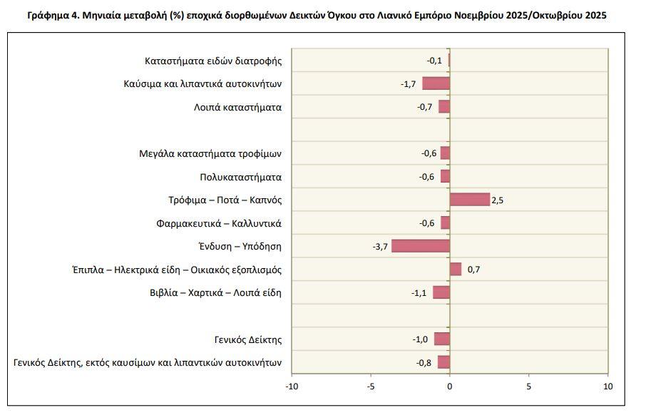 Σε μηνιαία βάση αύξηση καταγράφηκε τον Νοέμβριο σε σχέση με τον Οκτώβριο 2025 στα τρόφιμα-ποτά-καπνός κατά 2,5% και στα έπιπλα-ηλεκτρικά είδη-οικιακός εξοπλισμός 0,7%, ενώ μείωσε σημειώθηκε κατά 3,7% σε ένδυση-υπόδηση, 1,7% στα καύσιμα-λιπαντικά αυτοκινήτων και 1,1% στα βιβλία-χαρτικά.