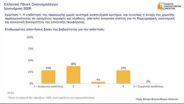 Συνολικά, τα ευρήματα της ερώτησης του Ιανουαρίου δείχνουν ότι η πλειοψηφία των μελών του Ελληνικού Πάνελ Οικονομολόγων αμφισβητεί τη λογική της ανοχής της χαμηλής παραγωγικότητας ως αναγκαίου κόστους για την περιφέρεια, υπογραμμίζοντας την ανάγκη για πολιτικές με σαφή στόχευση, αυξημένη λογοδοσία και ενίσχυση της πραγματικής αναπτυξιακής δυναμικής των περιοχών εκτός των μεγάλων αστικών κέντρων.
