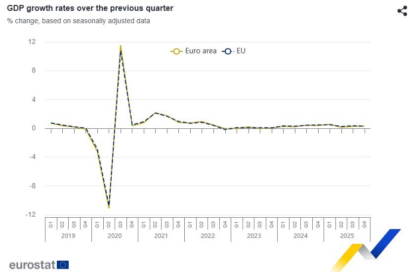 Κατά 1,3% αυξήθηκε το ΑΕΠ στην ευρωζώνη στο τέταρτο τρίμηνο του 2025, σε ετήσια βάση, και κατά 1,4% στην Ευρωπαϊκή Ένωση, σύμφωνα με τα τριμηνιαία εποχικά και ημερολογιακά διορθωμένα δεδομένα που έδωσε στη δημοσιότητα η ευρωπαϊκή στατιστική υπηρεσία Eurostat.