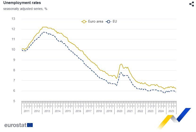 Η Eurostat εκτιμά ότι 13,043 εκατομμύρια άτομα στην ΕΕ, εκ των οποίων 10,792 εκατομμύρια στη ζώνη του ευρώ, ήταν άνεργα τον Δεκέμβριο του 2025.