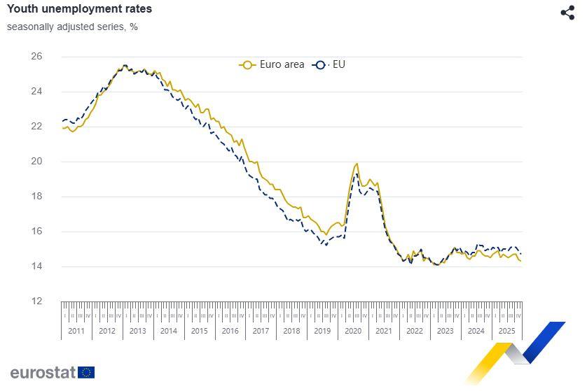 Τον Δεκέμβριο του 2025, 2,857 εκατομμύρια νέοι (κάτω των 25 ετών) ήταν άνεργοι στην ΕΕ, εκ των οποίων 2,257 εκατομμύρια στην ευρωζώνη. Τον Δεκέμβριο του 2025, το ποσοστό ανεργίας των νέων ήταν 14,7 % στην ΕΕ, σε μείωση από 14,9 % τον προηγούμενο μήνα, και 14,3 % στη ζώνη του ευρώ, επίσης σε μείωση από 14,4 % τον Νοέμβριο του 2025.