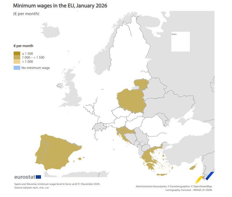 Σε σύγκριση με τον Ιανουάριο του 2025, 3 χώρες έχουν αλλάξει ομάδα το 2026: οι ελάχιστοι μισθοί που ισχύουν στη Σλοβακία, τη Βουλγαρία και την Τσεχία είναι πλέον πάνω από 1.000 PPS ανά μήνα.