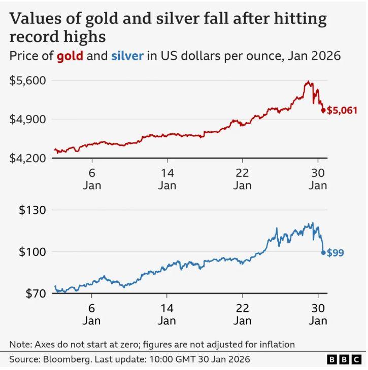 Τα συμβόλαια μελλοντικής εκπλήρωσης του χρυσού έκλεισαν στα 4.745 δολάρια, σημειώνοντας πτώση 11%. Τα πιο ενεργά συμβόλαια μελλοντικής εκπλήρωσης αργύρου έκλεισαν με πτώση 31% στα 78,53 δολάρια, σημειώνοντας τη μεγαλύτερη ημερήσια πτώση από τη βουτιά κατά σχεδόν 32% τον Μάρτιο του 1980.