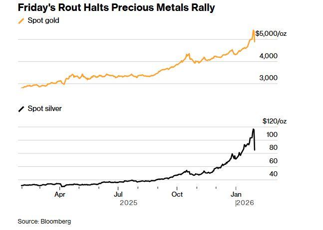 «Παραβολική», «φρενήρης» και «μη εμπορεύσιμη» ήταν οι περιγραφές της αγοράς την Παρασκευή, έγραψε η Nicky Shiels, επικεφαλής της στρατηγικής μετάλλων στην MKS PAMP SA. Ο Ιανουάριος του 2026, είπε, θα μείνει στην ιστορία ως «ο πιο ασταθής μήνας στην ιστορία των πολύτιμων μετάλλων».