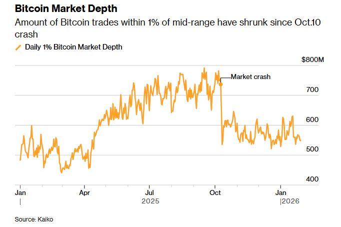Το βάθος της αγοράς του Bitcoin, ένα μέτρο του διαθέσιμου κεφαλαίου για την απορρόφηση μεγάλων συναλλαγών, παραμένει περισσότερο από 30% κάτω από την κορύφωση του Οκτωβρίου, σύμφωνα με στοιχεία της Kaiko. Η τελευταία φορά που η ρευστότητα μειώθηκε τόσο πολύ ήταν μετά την κατάρρευση του FTX το 2022.