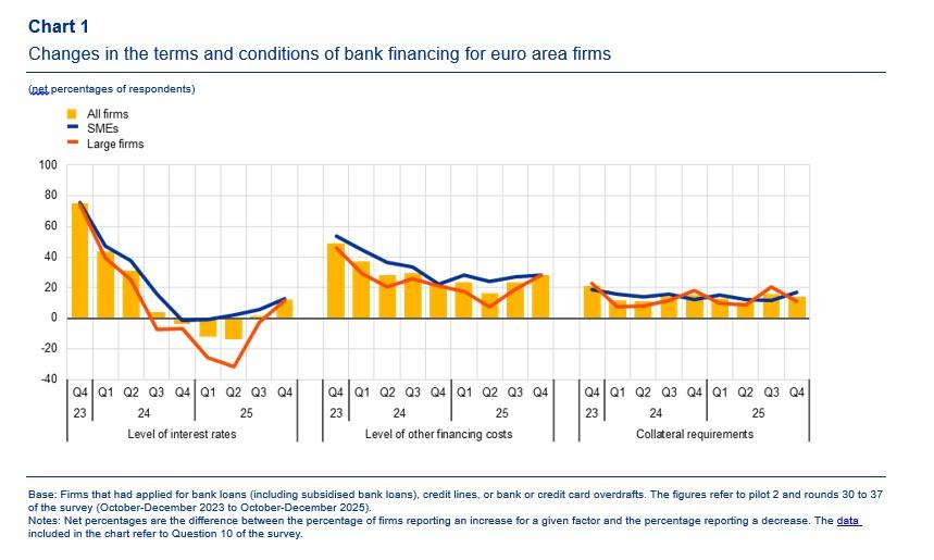 Στην πρόσφατα Έρευνα για την Πρόσβαση των Επιχειρήσεων στη Χρηματοδότηση (SAFE), που καλύπτει το τέταρτο τρίμηνο του 2025, οι επιχειρήσεις της ζώνης του ευρώ ανέφεραν καθαρή αύξηση των επιτοκίων των τραπεζικών δανείων (καθαρή αύξηση 12%, έναντι 2% το προηγούμενο τρίμηνο).