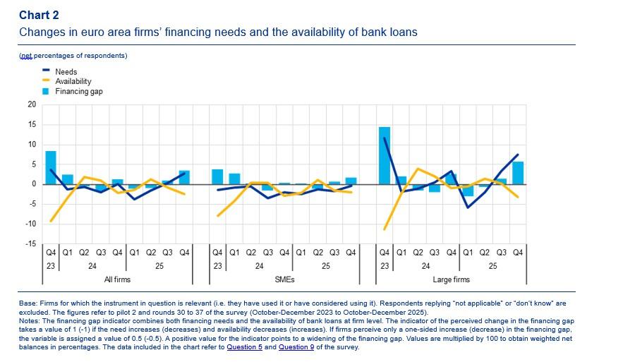 Στην παρούσα έρευνα, οι επιχειρήσεις ανέφεραν μια μικρή αύξηση των αναγκών τους για τραπεζικά δάνεια (καθαρό 3%, από 0% το τρίτο τρίμηνο του 2025), συνοδευόμενη από μια μικρή μείωση της διαθεσιμότητας (καθαρό -2%, από -1% το τρίτο τρίμηνο).