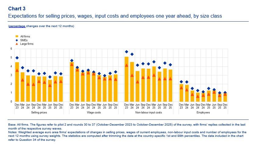 Οι επιχειρήσεις αναμένουν αύξηση των τιμών πώλησης κατά 2,9% κατά μέσο όρο τους επόμενους 12 μήνες (παρόμοια με την προηγούμενη έρευνα), ενώ το αντίστοιχο ποσοστό για τους μισθούς ήταν 3,1% (από 3% στην προηγούμενη έρευνα).