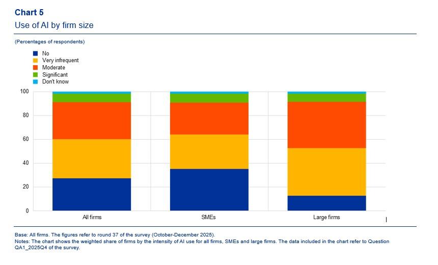 Οι ΜΜΕ είναι πιο πιθανό να μην χρησιμοποιούν AI σε σύγκριση με τις μεγάλες επιχειρήσεις (35% έναντι 13%) και είναι επίσης λιγότερο πιθανό να την δοκιμάσουν ή να την χρησιμοποιούν μέτρια. Ωστόσο, το ποσοστό των επιχειρήσεων που χρησιμοποιούν σημαντικά την AI είναι παρόμοιο για τις ΜΜΕ και τις μεγάλες επιχειρήσεις, γεγονός που υποδηλώνει ότι η χρήση της AI εξαπλώνεται και σε έναν πυρήνα μικρότερων επιχειρήσεων.