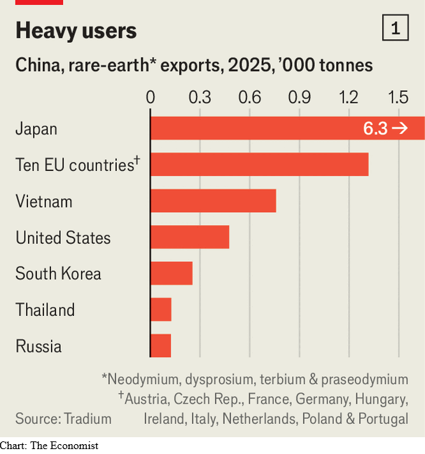 «Το 2025 η Κίνα έμαθε ότι μπορεί να διαταράξει τις ευρωπαϊκές βιομηχανίες με μικρό κόστος», υποστηρίζει ο Joris Teer του Ινστιτούτου Μελετών Ασφάλειας της ΕΕ, ενός think tank με έδρα το Παρίσι. Τον Οκτώβριο οι δύο υπερδυνάμεις συνήψαν εκεχειρία 12 μηνών και οι κινεζικές εξαγωγές ξανάρχισαν, αλλά αυτό μπορεί να μην διαρκέσει. Τον Ιανουάριο η Κίνα έσφιξε ξανά τις εξαγωγές προς την Ιαπωνία λόγω των δηλώσεων της πρωθυπουργου Σαναέ Τακαίτσι , σχετικά με την Ταϊβάν.