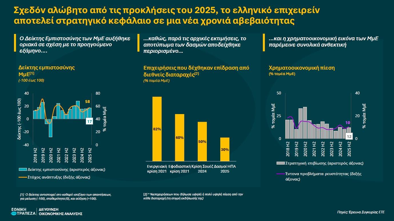 Σε μια χρονιά όπου η διεθνής αβεβαιότητα και για τις επιχειρήσεις κλιμακώθηκε σε ιστορικά υψηλά επίπεδα, η νέα Έρευνα Συγκυρίας σε ΜμΕ της Διεύθυνσης Οικονομικής Ανάλυσης της Εθνικής Τράπεζας εξετάζει με συστηματικό τρόπο πώς αυτές οι συνθήκες δοκίμασαν τις αντοχές του ελληνικού επιχειρείν.
