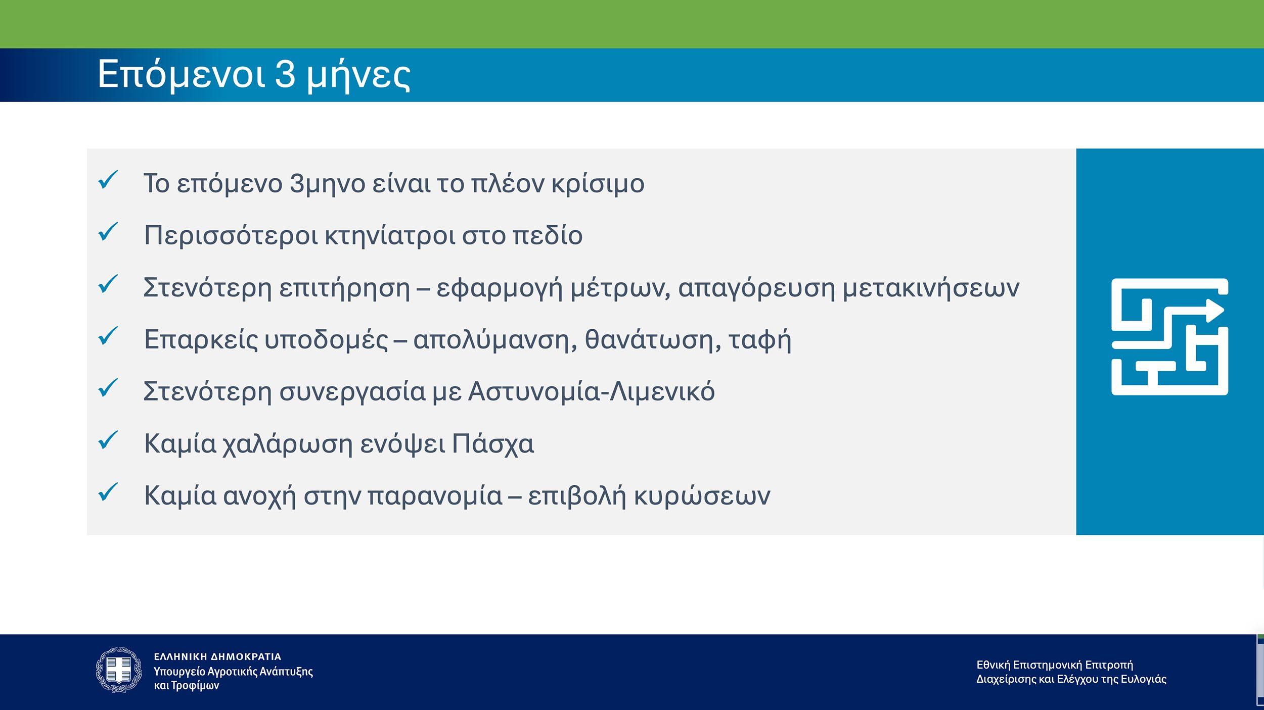 Όπως επισημάνθηκε το επόμενο τρίμηνο είναι καθοριστικό για την πορεία της νόσου, με το ΥπΑΑΤ και την Επιτροπή να δίνει ιδιαίτερη έμφαση στην εντατικοποίηση της επιτήρησης και συστηματικοί έλεγχοι στο πεδίο, καθώς και στην αυστηρή εφαρμογή των μέτρων βιοασφάλειας στις εκτροφές.
