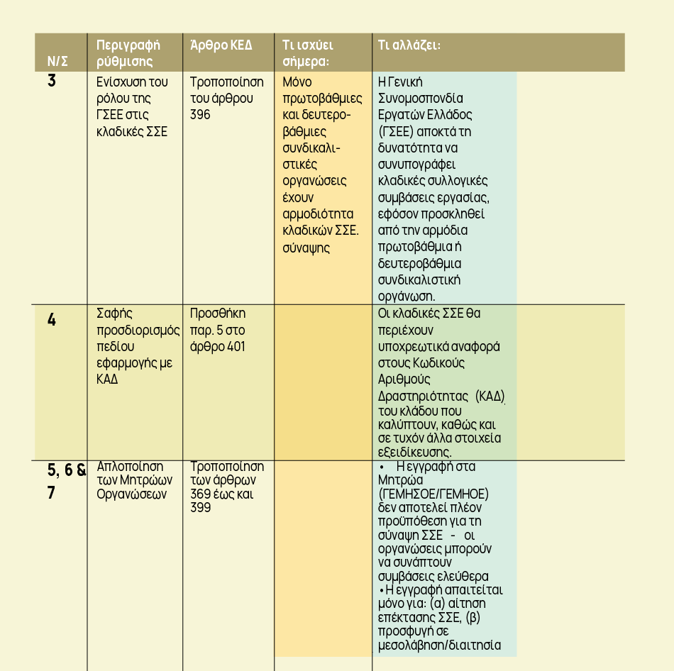 1) Με το άρθρο 3 του Ν/Σ Τροποποίηση άρθρου 396 Κώδικα Εργατικού Δικαίου) με ενίσχυση του ρόλου της ΓΣΕΕ στις κλαδικές ΣΣΕ.