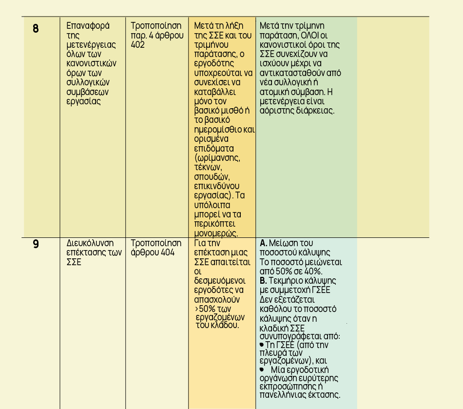 5) Με το άρθρο 9 έχουμε τροποποίηση άρθρου 404 Κώδικα Εργατικού Δικαίου με την οποία γίνεται διευκόλυνση επέκτασης των ΣΣΕ τόσο με την Μείωση του ποσοστού κάλυψης από 50% σε 40% των εργαζομένων που απασχολούν επιχειρήσεις μέλη των συμμετεχουσών εργοδοτικών οργανώσεων όσο και με εισαγωγή του τεκμηρίου κάλυψης με συμμετοχή ΓΣΕΕ στην σύναψη της ΣΣΕ. Ειδικότερα: