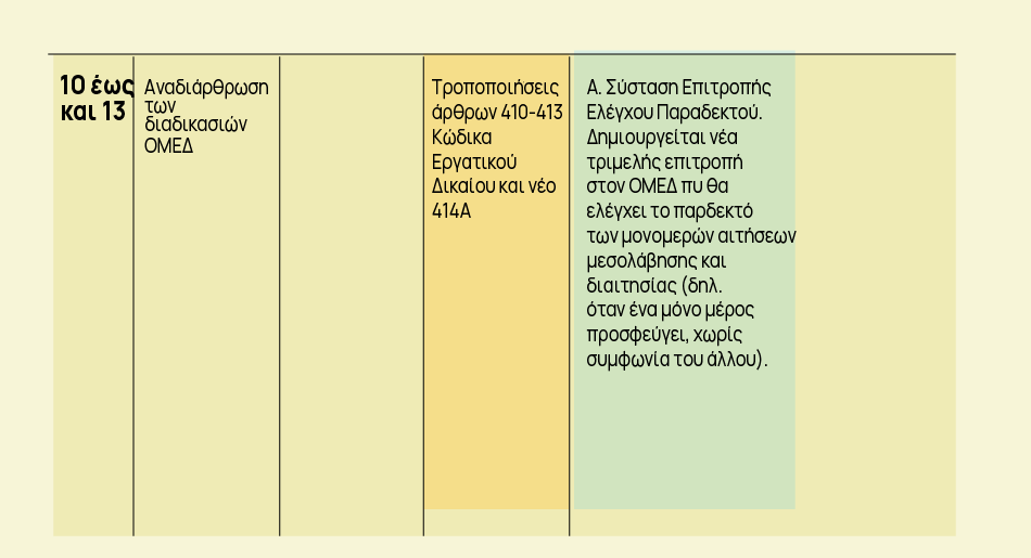 6) Με τα άρθρα 10 έως και 13 γίνονται Τροποποιήσεις άρθρων 410 έως και 413 Κώδικα Εργατικού Δικαίου και προσθήκη νέο 414Α με τα οποία ρυθμίζονται θέματα του ΟΜΕΔ.
