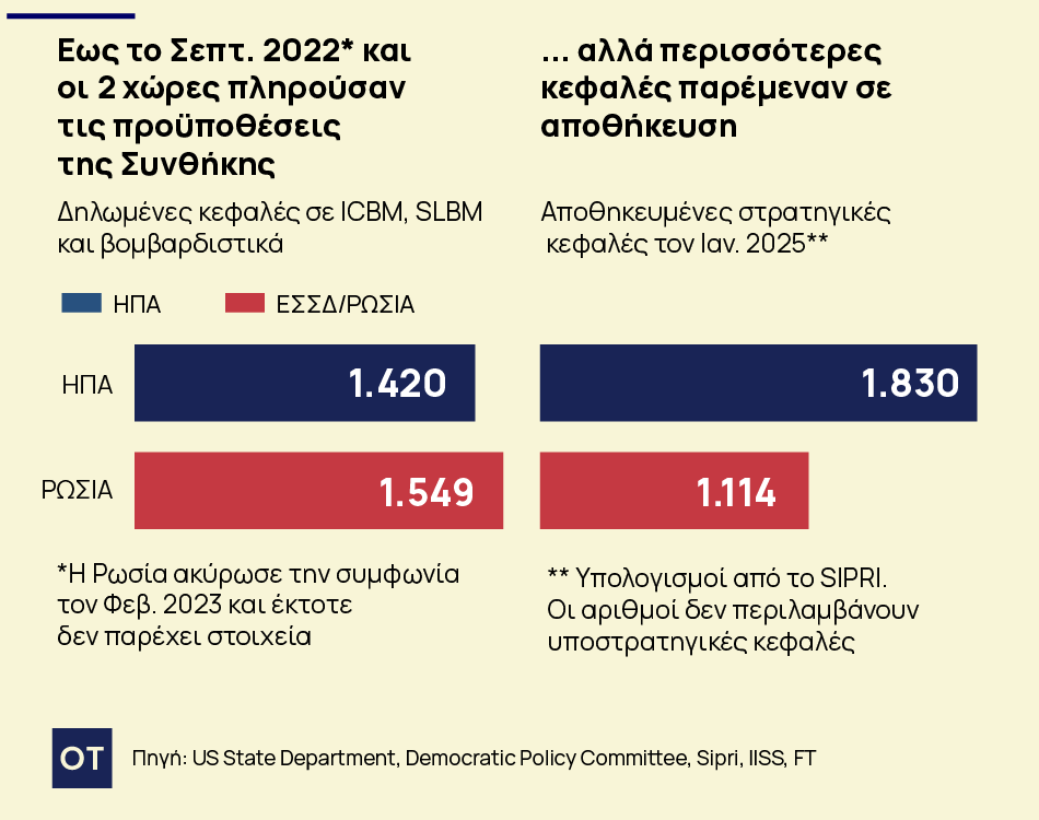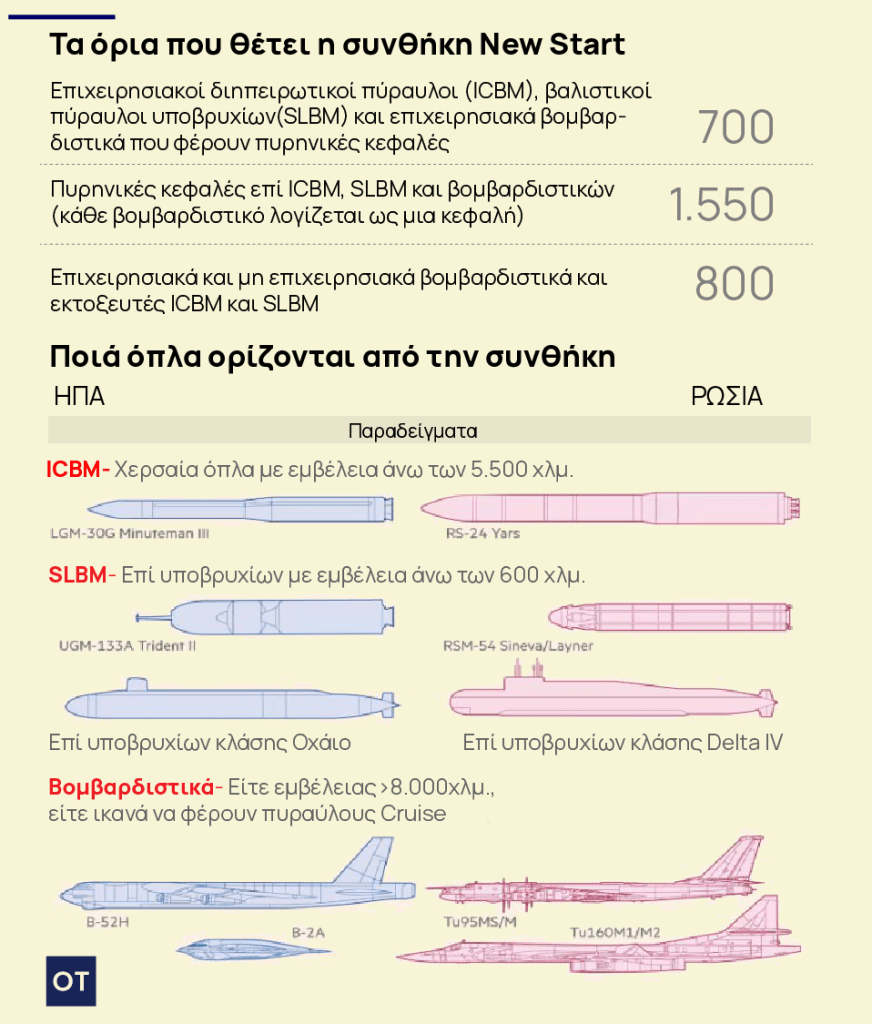 Η συνθήκη New Start, η οποία περιορίζει τον αριθμό των λειτουργικών πυραύλων και κεφαλών στα δύο μεγαλύτερα πυρηνικά οπλοστάσια του κόσμου, λήγει σήμερα Πέμπτη. Με τις προοπτικές για μελλοντικές συνομιλίες να φαίνονται αμυδρές, ενδεχομένως να ανοίγει μια νέα εποχή πυρηνικής αμφισβήτησης μεταξύ μεγάλων δυνάμεων.