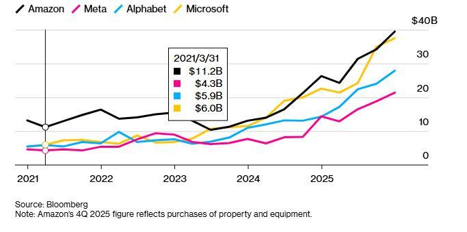 Την περασμένη εβδομάδα, η Meta ανακοίνωσε ότι οι ετήσιες κεφαλαιουχικές δαπάνες θα αυξηθούν έως και 135 δισεκατομμύρια δολάρια — μια πιθανή αύξηση περίπου 87%. Την ίδια μέρα, η Microsoft ανακοίνωσε αύξηση 66% στις κεφαλαιουχικές δαπάνες του δεύτερου τριμήνου, ξεπερνώντας τις εκτιμήσεις, και οι αναλυτές προβλέπουν ότι θα δαπανήσει σχεδόν 105 δισεκατομμύρια δολάρια σε κεφαλαιουχικές δαπάνες για το οικονομικό έτος που λήγει τον Ιούνιο. Η είδηση προκάλεσε τη δεύτερη μεγαλύτερη ημερήσια πτώση της αγοραίας αξίας για οποιαδήποτε μετοχή.