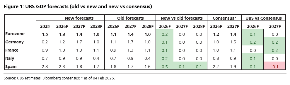 Η UBS αναθεώρησε ανοδικά και την πρόβλεψη για την ανάπτυξη του ΑΕΠ της Ευρωζώνης για το 2026 κατά 0,2 ποσοστιαίες μονάδες, στο 1,3%, ενώ διατηρεί αμετάβλητες τις εκτιμήσεις για το 2027 και το 2028, στο 1,4% και 1% αντίστοιχα.