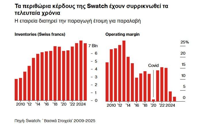 Το περιθώριο κέρδους της Swatch μειώθηκε σε μόλις 2,1% το 2025. Η εταιρεία έχει μια πολιτική διατήρησης θέσεων εργασίας και παραγωγής για να είναι έτοιμη για μια ανάκαμψη, καθώς και περίπου 9,4 δισ. δολάρια σε αποθέματα.