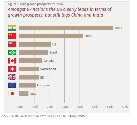 Έχοντας ένα εξαιρετικό σκορ στις προβλέψεις για την παγκόσμια οικονομία για το 2025 με 8 στις 10 να έχουν αποδειχθεί σωστές η EFG εκτιμά ότι οι ΗΠΑ θα είναι η ταχύτερα αναπτυσσόμενη προηγμένη οικονομία. Η ανάπτυξη της στηρίζεται σε τρεις δομικούς παράγοντες – οικονομική ανθεκτικότητα,ξεκάθαρο σχέδιο ανάπτυξης και ηγετική θέση στην Τεχνητή Νοημοσύνη- και σε τρεις κυκλικούς παράγοντες- περιβάλλον χαμηλών επιτοκίων, χαμηλότερες τιμές ενέργειας και δημοσιονομικά κίνητρα. Το Διεθνές Νομισματικό Ταμείο προβλέπει ανάπτυξη 2,4% και η EFG εκτιμά ότι μπορεί να ξεπεράσει αυτόν τον ρυθμό ανάπτυξης.