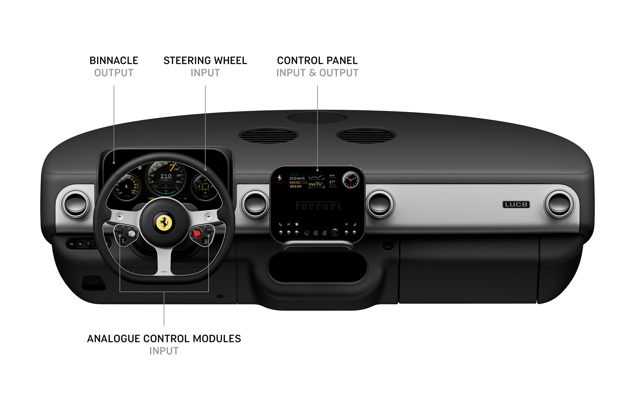 Η LoveFrom, μια δημιουργική κολεκτίβα που ιδρύθηκε από τους σχεδιαστές Sir Jony Ive και Marc Newson στο Σαν Φρανσίσκο, συνεργάζεται με τη Ferrari για το σχεδιασμό του Luce, σύμφωνα με την αυτοκινητοβιομηχανία.