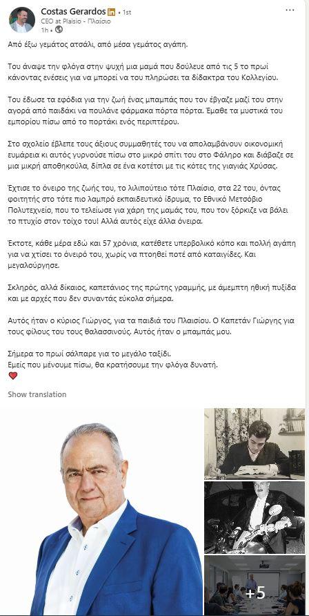 Σε μια ανάρτηση στον προσωπικό του λογαριασμό στο LinkedIn προχώρησε ο γιος του Γιώργου Γεράρδου, Κώστας, αποχαιρετώντας τον πατέρα του, ιδρυτή του Πλαισίου.