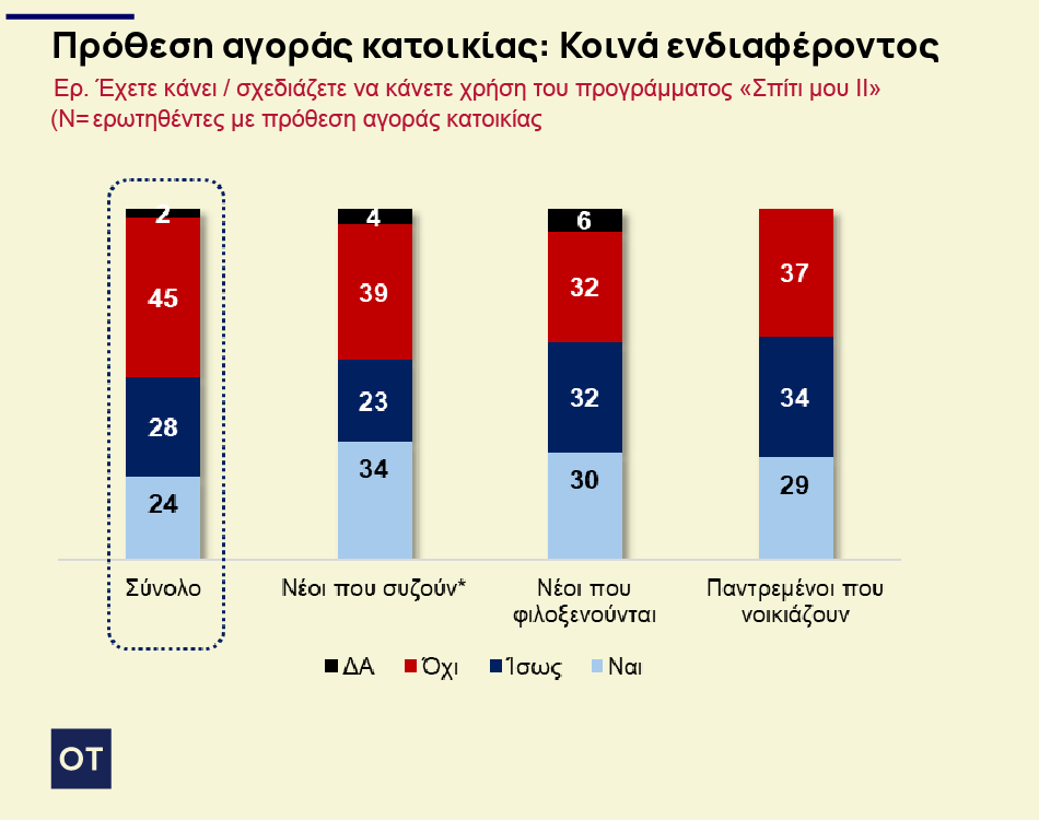 Το ενδιαφέρον για το πρόγραμμα «Σπίτι μου II» είναι υπαρκτό αλλά όχι καθολικό. Το 24% των ενδιαφερομένων είχε υποβάλει ή σχεδίαζε να υποβάλει αίτηση την περίοδο διεξαγωγής της έρευνας, ενώ το 45% αποκλείει αυτό το ενδεχόμενο, κυρίως λόγω εισοδηματικών και ηλικιακών κριτηρίων.