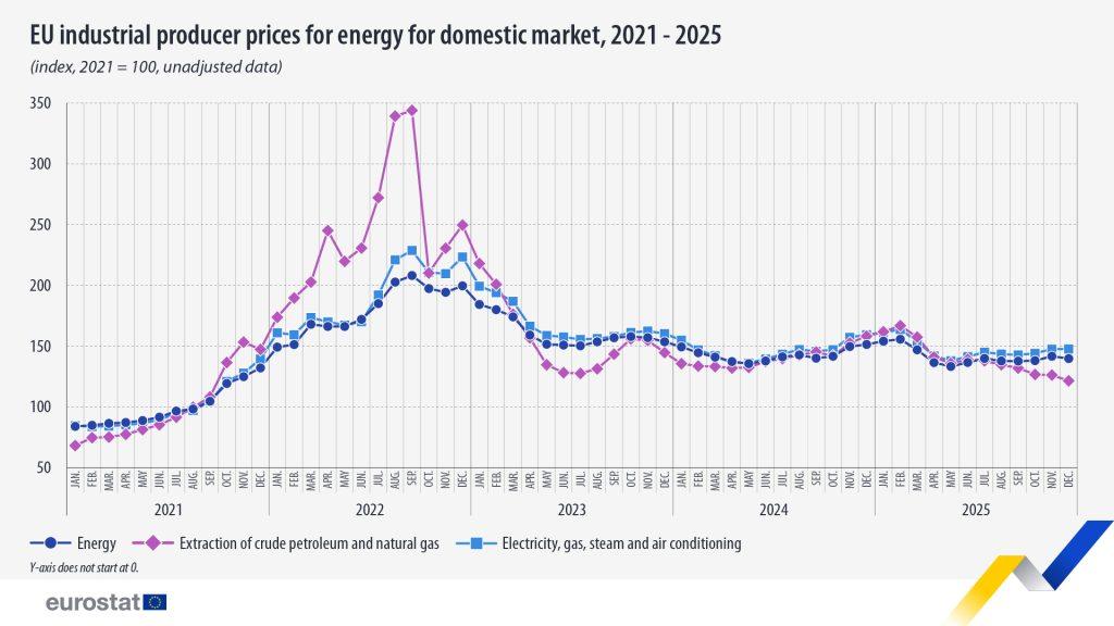 Οι τιμές παραγωγού στη βιομηχανία ενέργειας στην ΕΕ μειώθηκαν κατά 1,3% τον Δεκέμβριο του 2025 σε σύγκριση με τον προηγούμενο μήνα και κατά 7,7% σε σύγκριση με τον Δεκέμβριο του 2024, σύμφωνα με τα στοιχεία της ευρωπαϊκής στατιστικής υπηρεσίας, Εurostat.