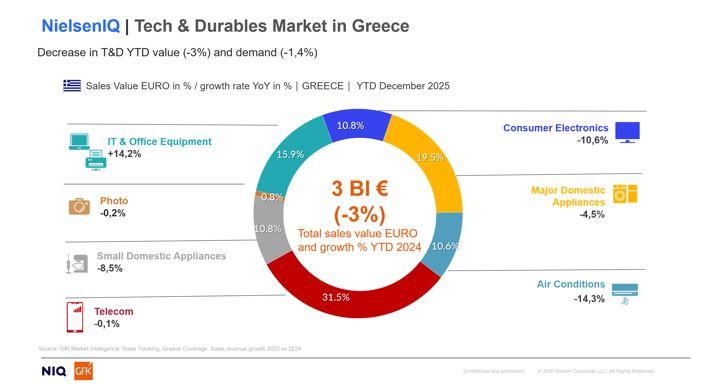 Για τρίτη συνεχόμενη χρονιά το 2025 ο τζίρος στο λιανεμπόριο για την αγορά των Tech & Durables στην Ελλάδα διατηρήθηκε περίπου στα 3 δισ. ευρώ, παρατηρώντας ωστόσο μια μείωση της τάξης του 3%, σε σχέση με το 2024.
