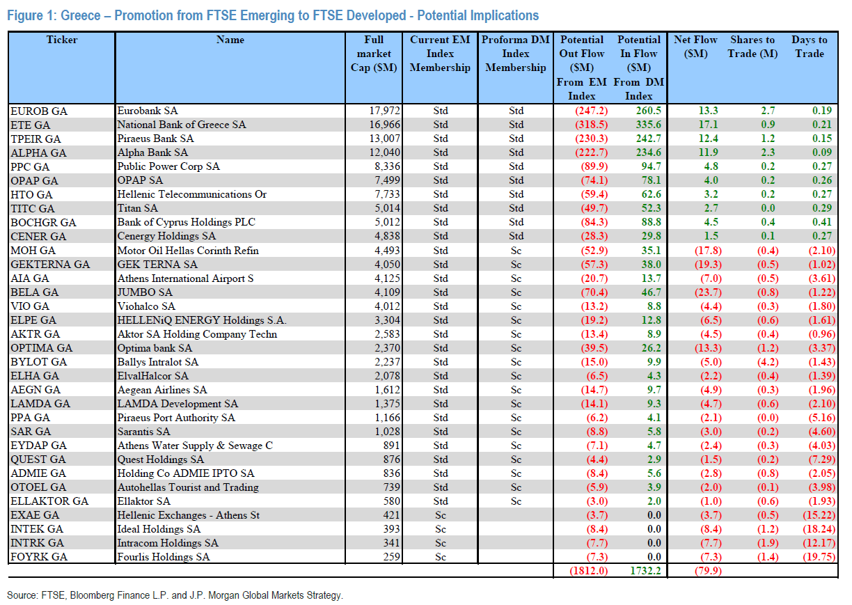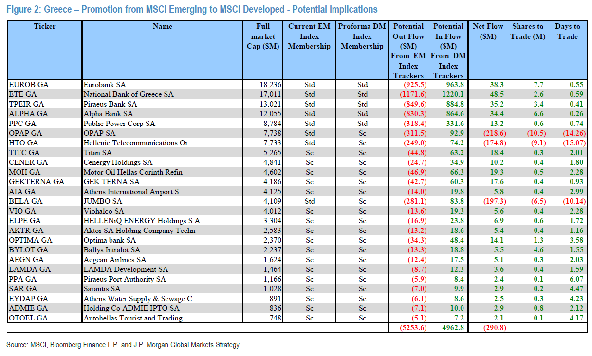 Παρότι η Ελλάδα πληροί πλέον τα περισσότερα κριτήρια Ανεπτυγμένης Αγοράς, η JP Morgan εκτιμά ότι οι καθαρές παθητικές ροές από τα funds που παρακολουθούν τους δείκτες MSCI και FTSE θα είναι οριακά αρνητικές, καθώς τα κεφάλαια που επενδύουν σε Αναδυόμενες Αγορές (EM) θα προχωρήσουν σε πωλήσεις ελληνικών μετοχών, ενώ τα κεφάλαια Ανεπτυγμένων Αγορών (DM) θα πραγματοποιήσουν αγορές.