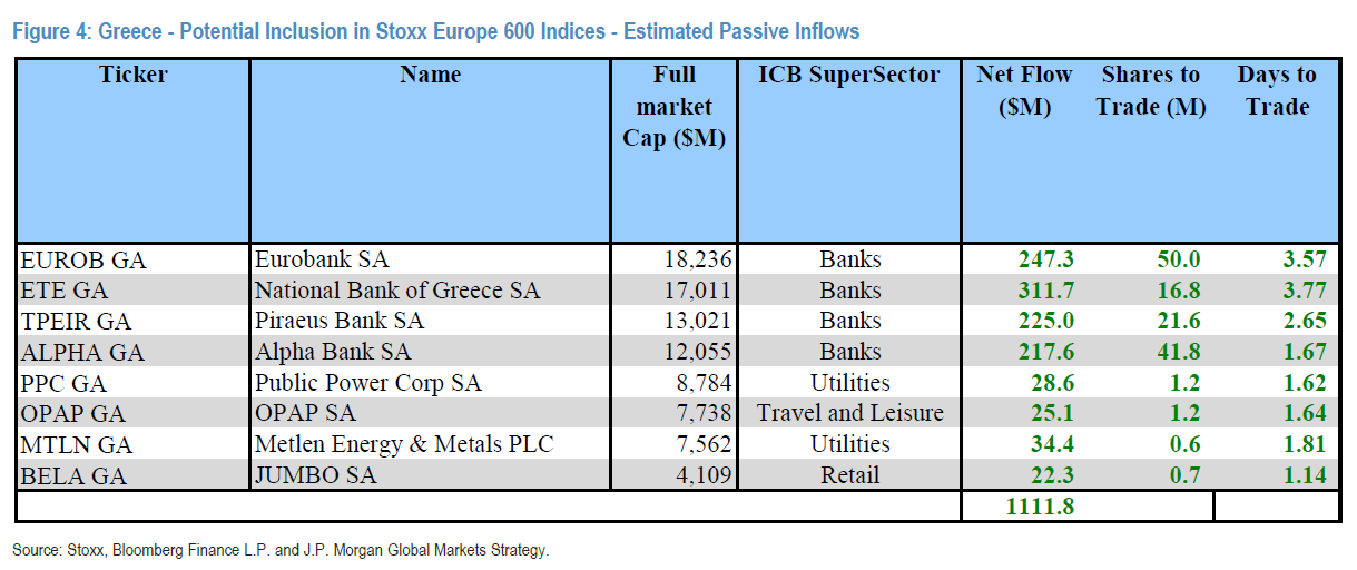 Εφόσον η Ελλάδα αναβαθμιστεί, οι ελληνικές μετοχές θα μπορούν να ενταχθούν στους δείκτες STOXX Europe 600 και Eurostoxx. Η JP Morgan εκτιμά ότι οι συνολικές παθητικές εισροές σε ελληνικές μετοχές, σε περίπτωση ένταξης στους συγκεκριμένους δείκτες, θα ανέλθουν σε περίπου 1,1 δισ. δολάρια.