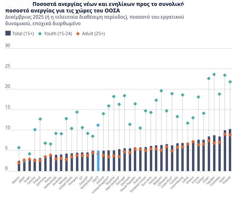 Τα ποσοστά ανεργίας των γυναικών, των ανδρών και των εργαζομένων ηλικίας 25 ετών και άνω στον ΟΟΣΑ παρέμειναν σε γενικές γραμμές σταθερά σε σύγκριση με τον Νοέμβριο του 2025.