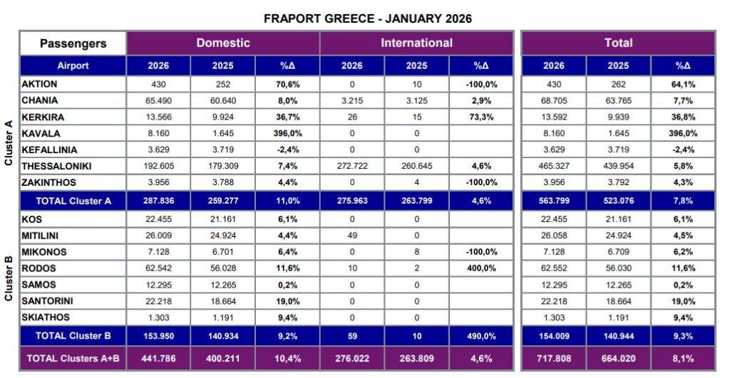 Αύξηση 8,1% σημείωσε η διακίνηση επιβατών στα υπό τη διαχείριση της Fraport Greece αεροδρόμια τον Ιανουάριο του 2026. Συγεκριμένα διακινήθηκαν 718. 000, 54.000 περισσότεροι σε σύγκριση με τον αντίστοιχο μήνα του 2025.