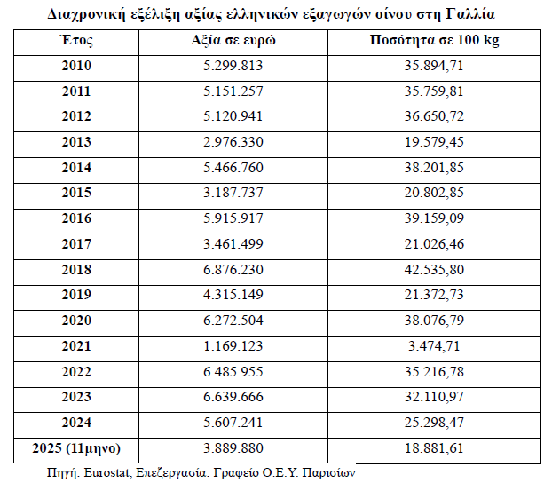 Η πορεία των ελληνικών εξαγωγών οίνου στη γαλλική αγορά κατά την τελευταία εικοσαετία αναδεικνύει μια στρατηγική μετατόπιση προς την ποιότητα και την υψηλή προστιθέμενη αξία