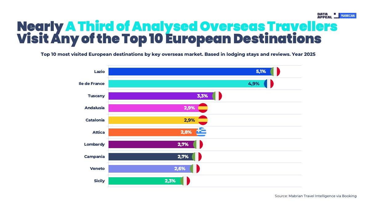 Η έρευνα έδειξε ότι οι εμβληματικές περιοχές της Ιταλίας, (Λάτιο, Τοσκάνη, Λομβαρδία, Καμπανία, Βένετο και Σικελία), της Ισπανίας (Ανδαλουσία και Καταλονία), της Γαλλίας (Ιλλ-ντε-Φρανς) και της Ελλάδας (Αττική) αντιπροσωπεύουν σχεδόν το ένα τρίτο (32,2%) του συνόλου των διαμονών ταξιδιωτών από το εξωτερικό σε ευρωπαϊκούς προορισμούς το 2025. Η Αττική με μερίδιο 2,8% βρίσκεται στην έκτη θέση. Στην πρώτη θέση με μερίδιο 5,1% βρίσκεται η περιοχή του Λάτιο με πρωτεύουσα τη Ρώμη.