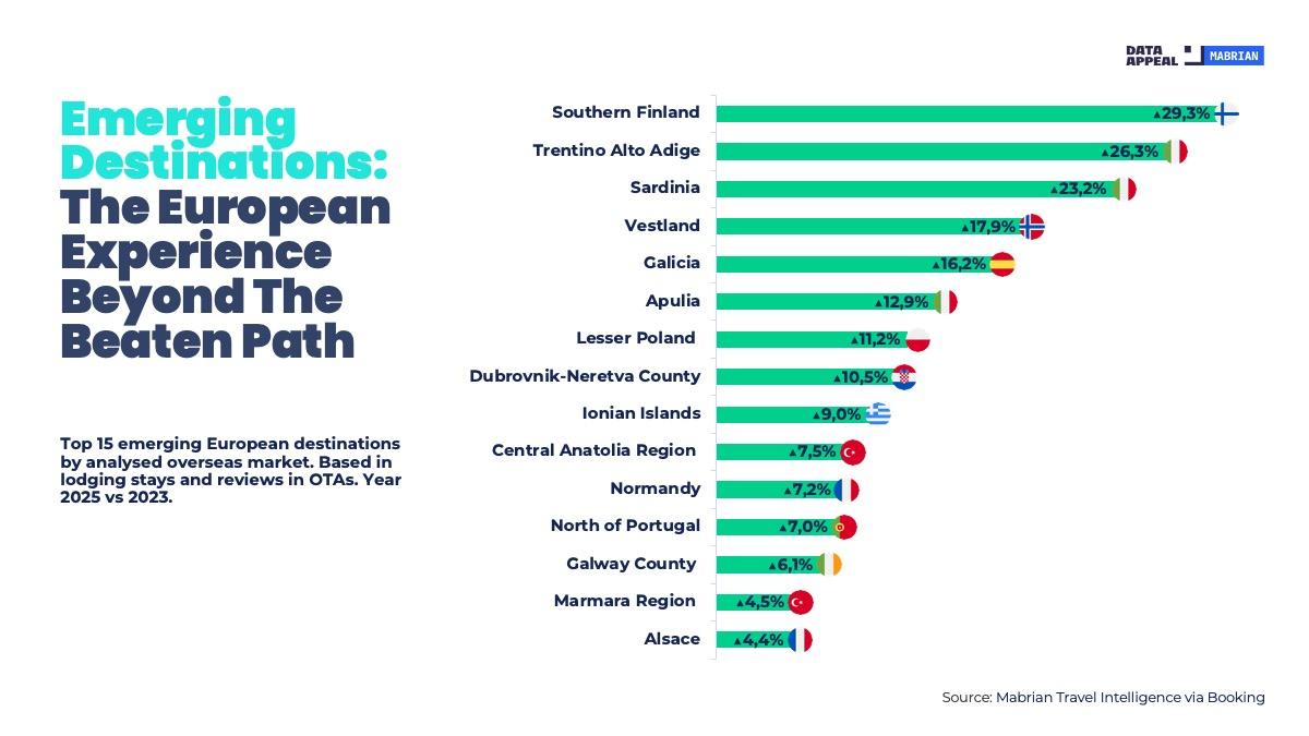 Σύμφωνα με την έρευνα, τα Ιόνια Νησιά συγκαταλέγονται στους 15 ευρωπαϊκούς προορισμούς με τη μεγαλύτερη δυναμική ανόδου. Στην κορυφή της λίστας βρίσκεται η Νότια Φινλανδία, καταγράφοντας αύξηση 29,3%, ενώ ακολουθούν το Τρεντίνο – Άνω Αδίγη με 26,3% και η Σαρδηνία με 23,2%.